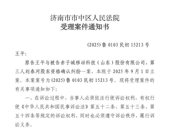 2025年9月1日,赤子城(的创始人刘春河,因股东资格确认纠纷被自己的“证婚人”、早年合作伙伴、智明远扬公司创始人王平告上法庭。目前该案已在济南市市中区人民法院被受理。