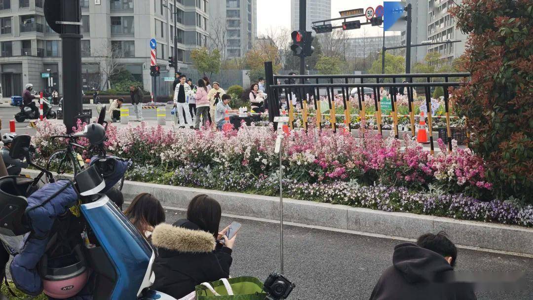 平澜路绿化带里的郁金香一夜盛放,来到这里会看到一幅奇幻的景象:马路中央的花坛被里三层外三层地包围,游客排队拍照,电商主播举着五花八门的产品,在花坛边排队拍短视频、直播,场面堪称壮观。