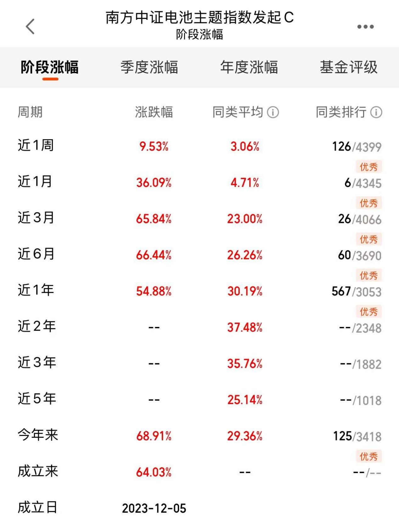 从投资角度看,固态电池产业链条长、技术路线复杂,对普通投资者来说确实存在不小的选择难度。比如不同企业选择的技术路径就有明显差异,有的公司走氧化物电解质路线,有的则专注于硫化物体系。这种技术路线的不确定性,意味着押注单一企业的风险较高。在这种情况下,不妨考虑借助指数基金这样的工具来把握产业趋势。比如聚焦电池赛道的$南方中证电池主题指数发起C$(018927),它的优势在于覆盖了从锂矿开采到电池组装的完整产业链,能够动态捕捉产业龙头变化。当固态电池技术路线逐渐明朗时,这类基金的持仓会自动向那些取得实质性突破的企业倾斜。从业绩表现来看,这款产品近期的表现相当不错,近一周收益率达到9.53%,近一月涨幅为36.09%,近三个月累计上涨65.84%,近半年收获66.44%的收益,近一年收益率达到54.88%。这样的业绩表现,确实为投资者提供了不错的参考。