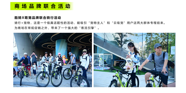 精准的跨界破圈实践:与宝马、蕉下、TR1搏击、伊维斯等不同领域品牌的成功联动,展示了其精准触达亲子家庭、潮流运动及都市精英人群的能力。与蕉下联合的成人骑行活动,在公园与海岸线场景中,共同倡导户外健康生活;与萌宠品牌结合的骑游活动,则成功吸引了庞大的宠物爱好群体,创造了高话题度的客流引擎。实现了品牌价值的相互增益。