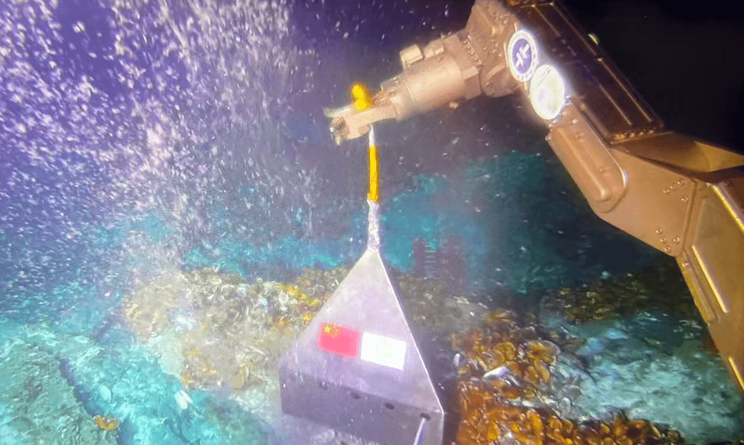 “源火”采集成功后,科研人员通过“海马”号在海底采集点位放置“十五运会与残特奥会‘源火’采集点”永久基点定位标,纪念这次具有开创性的“源火”采集行动。图/广州日报新花城记者 莫伟浓