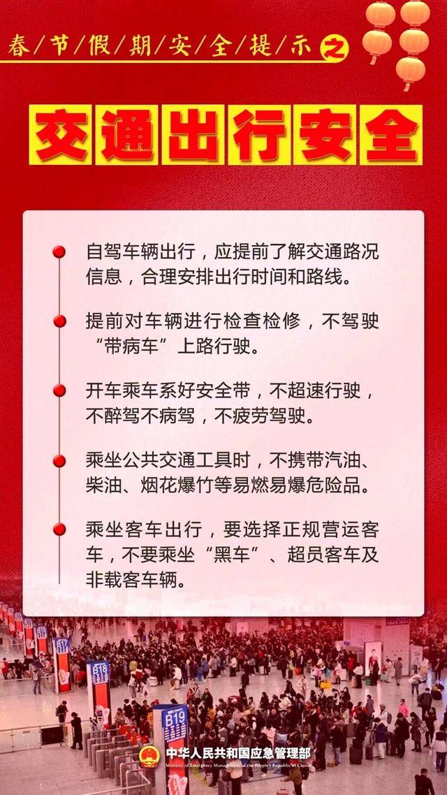 2、春节期间,赶集购物、走亲访友活动频繁,交通出行增多。乘坐客车出行,请到客运站选择正规营运车辆乘坐,切勿在站外、高速公路旁拦截车辆上车,切勿乘坐超员超速车辆、非法营运车辆、带“病”车辆、无牌无证车辆;严禁逾期未检验、未报废车辆上路行驶;切勿超员、超载、客货混装;货车、三轮车、拖拉机等车辆切勿违法载人。