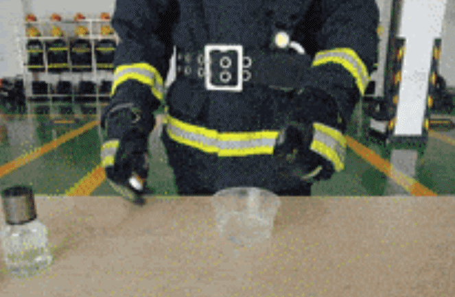 消防员在一个加入大量香水的透明盒子中放入点燃的纸条,香水遇明火后瞬间被引燃。