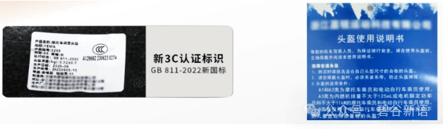 最后是要看头盔是否有执行标准为GB811-2022的中文永久标识和产品使用说明书。