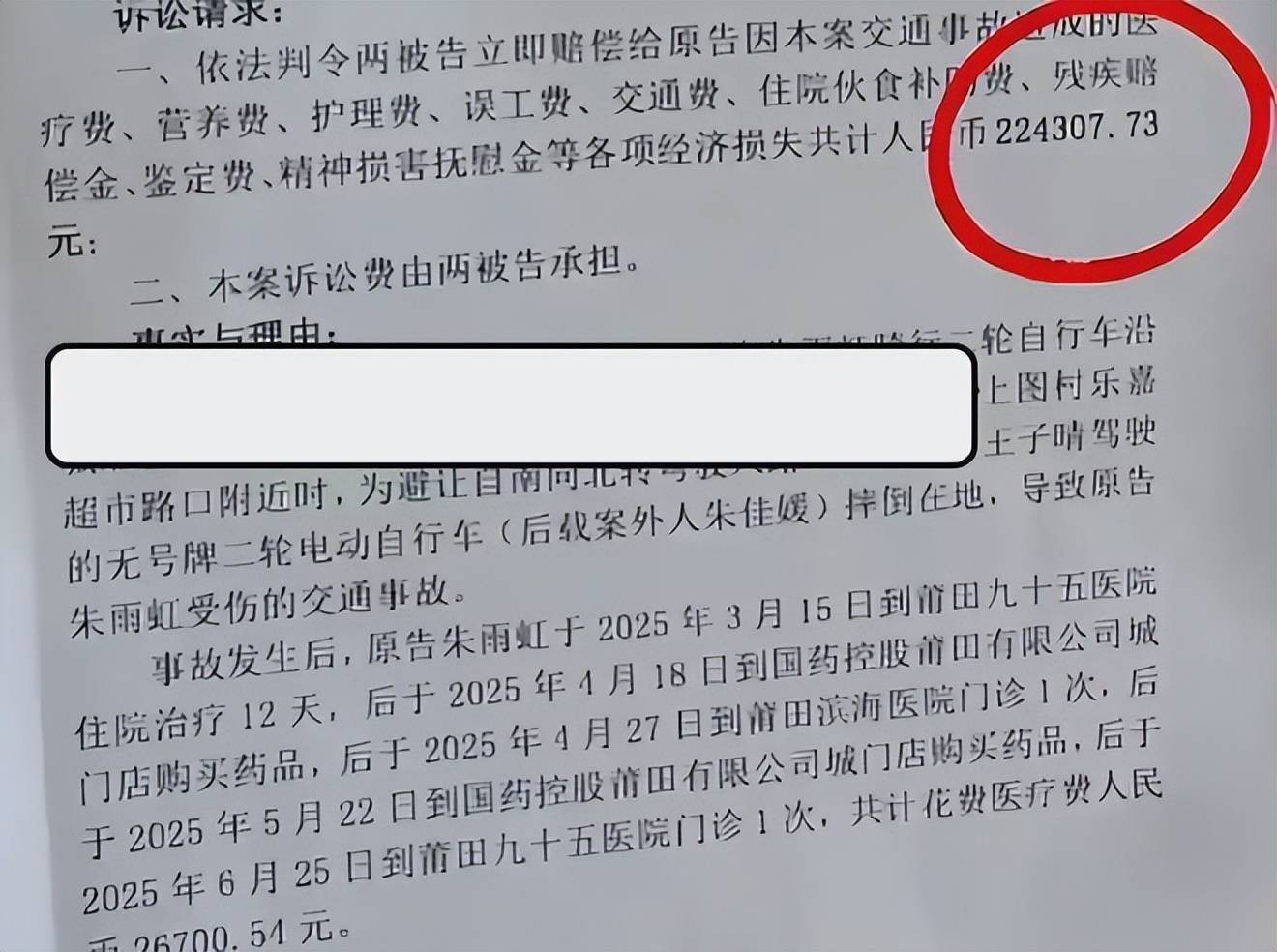 就是这个 “次要责任”,成了老人家属索要赔偿的 “尚方宝剑”。一纸民事起诉状递到法院,老人家属要求两名女生的监护人赔偿医疗费、营养费、残疾赔偿金、精神损害抚慰金等共计224307.73元。当这个数字摆在女生家长面前时,他们彻底懵了:不过是扶了个人,怎么就要赔二十多万?