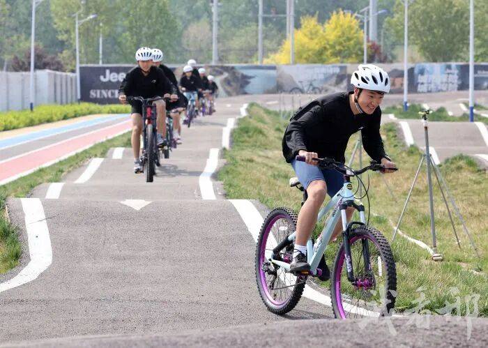 4月14日,在广宗县的河北瑞锋运动器材有限公司泵道场地,广宗县青少年自行车青训队正在进行集训。王垒摄
